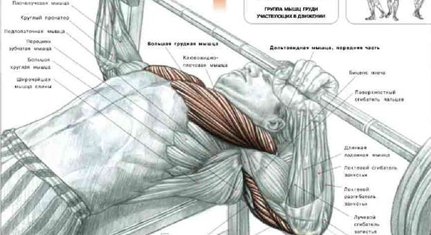 Схема выполнения жима штанги лежа: Лечь на спину, на горизонтальную скамью. Ягодицы и лопатки должны быть плотно прижаты к поверхности скамьи, ноги поставить на пол всей ступней: - взять гриф штанги хватом сверху шире плеч; - сделать вдох и медленно опустить штангу до уровня груди, контролируя движение; - выжать штангу и по окончании движения сделать выдох.