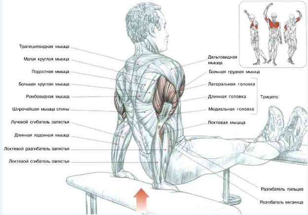 4 подхода с дополнительным весом, интервал между подходами 2 минуты Упражнение четвертое: Отжимания трицепсами спиной к скамье Отжимания трицепсами спиной к скамье - это упражнение очень эффективно прорабатывает трицепсы, грудные мышцы и передние отделы дельтовидных мышц.