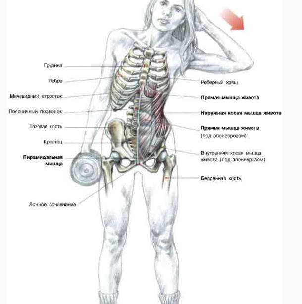 Когда вперед продвигается правое плечо, то в этом движении задействованы правая наружная косая мышца живота, левая внутренняя косая мышца живота (в глубине) и незначительно прямая мышца живота, квадратная мышца поясницы и левая мышца, разгибающая позвоночник. 1 подход на 2 минуты