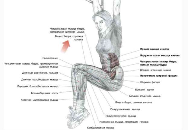 Это упражнение задействует: 1. подвздошно-поясничные, прямые мышцы бедер, напрягатели широких фасций при подъеме ног; 2. прямые мышцы живота и в меньшей мере косые мышцы, когда вы подтягиваете колени к груди. Для более изолированной работы мышц живота не опускайте колени ниже горизонтального положения.