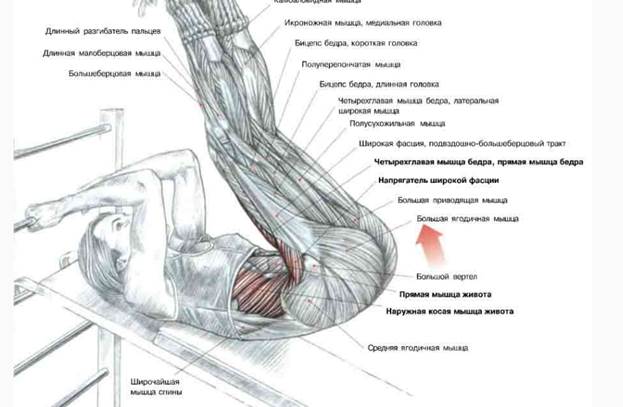 На первом этапе, когда вы поднимаете ноги, в работу вовлекаются подвздошно-поясничные мышцы, напрягатели широких фасций и прямые мышцы бедра в составе четырехглавых мышц. На втором этапе, когда вы приподнимаете таз и сворачиваете туловище, в работу вовлекаются также мышцы живота, главным образом верхние части прямых мышц. 4 подхода по максимум повторений, интервал – 5-10 секунд (суперсерия)