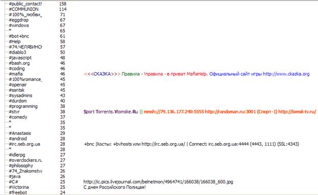 Подсоединиться к серверу TGU.Local В работе будет использоваться сервер irc.rusnet.org.ru [12: 38: 14] /server irc.rusnet.org.ru [12: 38: 14] Попытка соединение к irc.rusnet.org.ru (Одиночные сервера) через порт 6667 [12: 38: 14] Поиск сервера (irc.rusnet.org.ru)... [12: 38: 14] У сервера есть 4 IP адресов, выбираем случайный [12: 38: 14] Адрес сервера 89.105.192.85 [12: 38: 14] Подключение к IRC серверу irc.rusnet.org.ru (89.105.192.85) через порт 6667 [12: 38: 14] Соединение установлено [irc.rusnet.org.ru (89.105.192.85: 6667)] [12: 38: 14] Локальный адрес 5.28.24.57 [12: 38: 14] Вошел как Izjuzin! kvirc: Izjuzin [12: 38: 15] irc.anarxi.st: *** You are connected to RusNet. Please wait... [12: 38: 15] Подключение прошло успешно, добро пожаловать в IRC! [12: 38: 15] Welcome to the Internet Relay Network Izjuzin! kvirc@5.28.24.57 Вывести список каналов [12: 38: 35] [RAW]: LIST