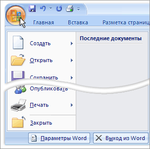 Наряду с вкладками, группами и командами, в Office Word 2007 для выполнения задач применяются и другие элементы. Эти элементы похожи на меню и панели инструментов, знакомые пользователям по предыдущим версиям Word: · Кнопка Microsoft Office.