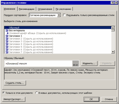 3. Нажмите кнопку Управление стилями. Откроется одноименное диалоговое окно: 4. На вкладке Изменение выберите стиль Обычный. 5. Нажмите кнопку Изменить. Откроется диалоговое окно Изменение стиля: