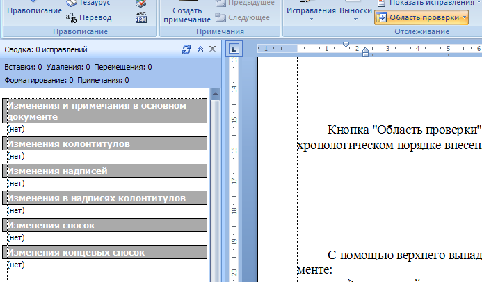 Кнопка " Область проверки" открывает дополнительную панель, на которой отображаются в хронологическом порядке внесение исправлений и добавления примечаний.