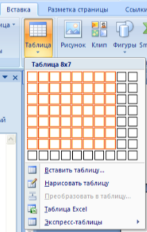Любая таблица состоит из строк и столбцов. Их пересечение образуют ячейки таблицы. Для вставки таблицы служит кнопка " Таблицы", расположенная на панели " Таблицы" лента " Вставка". При нажатии на эту кнопку можно в интерактивном режиме выбрать необходимое количество строк и столбцов для будущей таблицы.