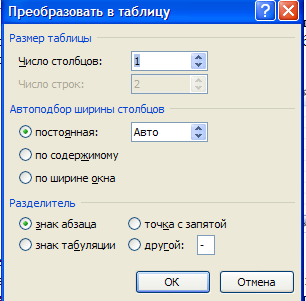 Можно превращать уже набранный текст в таблицу. Для этого необходимо выделить нужный блок текста и выбрать пункт меню " Преобразовать в таблицу". В появившемся окне надо задать параметры будущей таблицы. Следует иметь ввиду, что, фрагмент должен быть предварительно отформатирован символами-разделителями, чтобы программа смогла различить столбцы таблицы.
