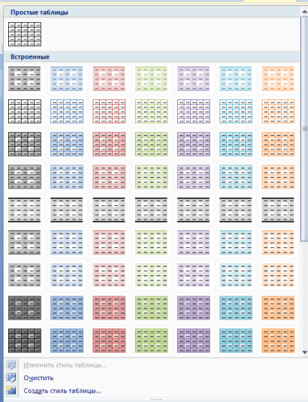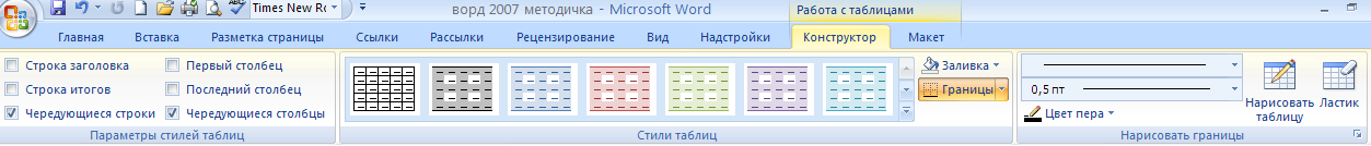 Word 2007 представляет большой выбор уже готовых вариантов форматирования таблиц. Все они расположены на панели " Стили таблиц". Панель " Параметры таблиц" позволяет устанавливать дополнительные параметры форматирования в дополнение к уже готовым стилям.