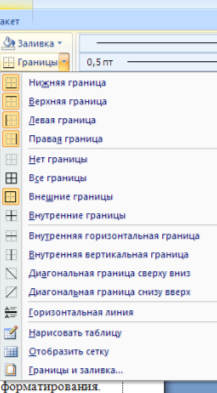 Для доступа к дополнительным параметрам настройки служит кнопка " Формат". Для настроек границ таблицы служит кнопка " Границы". Из ее контекстного меню можно выбрать различные типы границ.
