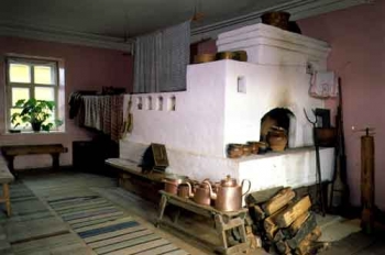 Что было центром любого славянского жилища? А. Одним из важнейших мест в доме был очаг. В первых славянских поселениях очаг был открытый, выложенный камнями; позднее славяне начинают делать закрытые очаги – печи, сооружая их в дальнем от входа углу из камня или глины. Печи лучше сохраняли тепло в доме, а вот приготовление пищи в первых печах было делом проблематичным. Печи обычно делали прямоугольными или круглыми, сужающимися кверху. Первоначально в печи было только одно небольшое отверстие, сбоку, куда закладывали дрова и откуда выходил дым, распространяя по помещению тепло (топка по-черному). В это отверстие можно было просунуть полено, но для того, чтобы поставить туда горшок с варевом или испечь хлеб, оно не годилось. Такие печи использовались только для отапливания помещения. Археологи установили, что славяне пекли хлеб в нежилых помещениях со специальными хлебными печами, которые имели большое устье. Приготовление другой пищи могло проходить на обычной печи. Иногда в верхней ее части делали глиняную жаровню или отверстие, в которое вставлялся горшок. Постепенно печь совершенствовалась. Славяне научились класть печи, пригодные не только для отапливания помещения, но и для выпекания хлеба, запекания, томления продуктов и приготовления жидкой пищи. Печь стала центром, вокруг которой сосредоточивалась жизнь. Если изначально размеры печи были относительно небольшими (примерно метр на метр), то позднее ее стали делать как можно больше, устраивая на печи спальное место. Переместив печь от задней стены жилища к противоположной, к самому выходу, славяне добились того, что тепло стало равномерно распространяться по всему жилищу, а дым стал быстрее уходить из помещения. Несколько позднее над печью появилась труба-дымоход (отапливание жилища «по-белому»), благодаря которой воздух в избе стал значительно чище. Но такая печь тепла давала все-таки меньше, поэтому на протяжении многих веков у славян сохранялись «курные избы», в которых так или иначе приходилось спасаться от дыма. Выход нашли в том, что избы стали строить очень высокими – три-четыре метра от пола до крыши. Дым в таких высоких строениях поднимался вверх, а внизу воздух оставался мало задымленным. К ночи дым из верхней части избы выветривался, а тепло, удерживаемое земляной засыпкой, сохранялось до утра, поэтому именно там, на двухметровой высоте, устраивались просторные полати, на которых спали всей семьей. Днем, когда топилась печь и дым заполнял верхнюю половину избы, на полатях никого не было — жизнь шла внизу, куда все время поступал свежий воздух с улицы. В верхней части избы хранились также вещи, которые не боялись копоти, просушивались сети и т.п. Печь была одним из сакральных мест славянского жилища.
