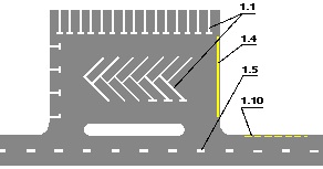 1.1 * - разделяет транспортные потоки противоположных направлений и обозначает границы полос движения в опасных местах на дорогах; обозначает границы проезжей части, на которые въезд запрещен; обозначает границы стояночных мест транспортных средств; 1.2.1 (сплошная линия) - обозначает край проезжей части; 1.2.2 (прерывистая линия, у которой длина штрихов в 2 раза короче промежутков между ними) - обозначает край проезжей части на двухполосных дорогах; 1.3 - разделяет транспортные потоки противоположных направлений на дорогах, имеющих четыре полосы движения и более; 1.4 - обозначает места, где запрещена остановка. Применяется самостоятельно или в сочетании со знаком 3.27 и наносится у края проезжей части или по верху бордюра; 1.5 - разделяет транспортные потоки противоположных направлений на дорогах, имеющих две или три полосы; обозначает границы полос движения при наличии двух и более полос, предназначенных для движения в одном направлении; 1.6 (линия приближения - прерывистая линия, у которой длина штрихов в 3 раза превышает промежутки между ними) - предупреждает о приближении к разметке 1.1 или 1.11, которая разделяет транспортные потоки противоположных или попутных направлений; 1.7 (прерывистая линия с короткими штрихами и равными им промежутками) - обозначает полосы движения в пределах перекрестка; 1.8 (широкая прерывистая линия) - обозначает границу между полосой разгона или торможения и основной полосой проезжей части (на перекрестках, пересечениях дорог на разных уровнях, в зоне автобусных остановок и тому подобное); 1.9 - обозначает границы полос движения, на которых осуществляется реверсивное регулирование; разделяет транспортные потоки противоположных направлений (при выключенных реверсивных светофорах) на дорогах, где осуществляется реверсивное регулирование; 1.10 - обозначает места, где запрещена стоянка. Применяется самостоятельно или в сочетании со знаком 3.28 и наносится у края проезжей части или по верху бордюра; 1.11 - разделяет транспортные потоки противоположных или попутных направлений на участках дорог, где перестроение разрешено только из одной полосы; обозначает места, предназначенные для разворота, въезда и выезда со стояночных площадок и тому подобного, где движение разрешено только в одну сторону; 1.12 (стоп-линия) - указывает место, где водитель должен остановиться при наличии знака 2.5 или при запрещающем сигнале светофора (регулировщика); 1.13 - указывает место, где водитель должен при необходимости остановиться уступая дорогу транспортным средствам, движущимся по пересекаемой дороге; 1.14.1, 1.14.2 (" зебра") - обозначает пешеходный переход; стрелы разметки 1.14.2 указывают направление движения пешеходов; 1.15 - обозначает место, где велосипедная дорожка пересекает проезжую часть; 1.16.1, 1.16.2, 1.16.3 - обозначает направляющие островки в местах разделения или слияния транспортных потоков; 1.17 - обозначает остановки маршрутных транспортных средств и стоянки такси; 1.18 - указывает разрешенные на перекрестке направления движения по полосам. Применяется самостоятельно или в сочетании со знаками 5.15.1, 5.15.2; разметка с изображением тупика наносится для указания того, что поворот на ближайшую проезжую часть запрещен; разметка, разрешающая поворот налево из крайней левой полосы, разрешает и разворот; 1.19 - предупреждает о приближении к сужению проезж