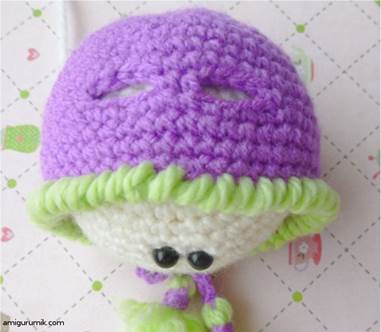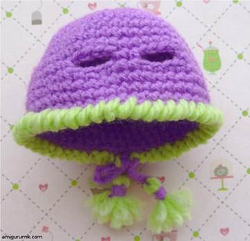 Теперь осталось пришить ножки, ручки, хвост и конечно же ушки. Ушки нужно пришить таким образом, чтобы они точно совпадали с отверстиями в капюшоне, иначе будет проблематично вытащить их наружу. Помимо белой и фиолетовой пряжи, также использовала зеленую для отделки капюшона и изготовления бомбошек. Глазки кролика — безопасные, нос вышит нитками «Ирис», наполнитель — синтепух. А теперь схема капюшона и ножек, если кому-то захочется связать зайчика сидящего без поддержки со снимающимся капюшоном. Капюшон (1 деталь) Итак, делаем скользящий узел и вяжем 2 ВП (воздушные петли).