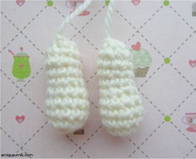 Когда капюшон готов, вяжем завязки и пришиваем бомбошки из пряжи того же цвета что и край капюшона. Ножки (2 детали) Скользящий узел и 2 ВП (воздушные петли).