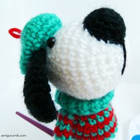 В центре беретика вышиваем петельку красной пряжей. Сборка · Пришиваем ножки к низу туловища, а ручки по бокам. · Ушки пришиваем голове. · Пришиваем нос, когда нос почти полностью пришит, добавляем внутрь немного наполнителя, чтобы он выделялся на фоне мордочки. · Добавляем наполнитель в берет с одной стороны, формируем нужную форму и пришиваем к голове немножко на бок. · Не забываем пришить хвостик. · Ну и напоследок пришиваем голову к туловищу. Вот и все наша амигуруми собачка-художник готова! Желаю всем приятного творчества и обязательно присылайте фотографии ваших собачек в нашу галерею:)