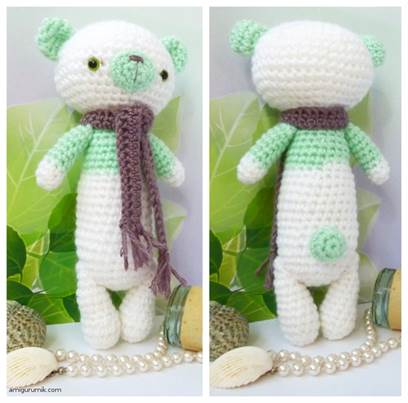 Шарфик (1 деталь) Набираем цепочку из 50 ВП, проходимся обычными СБН туда-обратно, кончики шарфика украшаем бахромой. Сборка Набиваем и сшиваем все детальки в единую конструкцию, повязываем шарфик и наш мятный амигуруми мишка готов:)