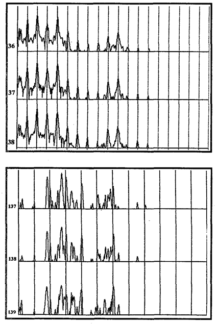 Рис. 13б. Примеры негармоничных спектров голоса при выражении гнева. Солист тяжелого рока. Обозначения те же, что и на рис. 13а. (по Морозов, Кузнецов, Харуто, 1995). В последнее время обнаружено, что такие эмоционально-эстетические категории, как минор и мажор реализуются в вокальном искусстве специфическим перераспределением частотного расположения обертонов голоса (Морозов, Кузнецов, 1994). Указанное явление, получившее название «феномен квазигармоничности» лежит в основе эмоциональной выразительности голоса (как в пении, так и в речи). Экспериментальные исследования показали, что голоса певцов разных жанров характеризуются разной степенью эмоциональности и гармоничности обертонов. Для академических певцов, в целом, характерно преобладание положительных эмоций (радость благополучие, уравновешенность), а для солистов тяжелого рока - отрицательных (гнев, беспокойство, страх). Далее были проведены исследования степени гармоничности обертонов голоса у певцов указанных групп: с помощью специальных компьютерных методов вычислялись усредненные значения степени отклонения каждого из первых десяти обертонов (%) от их идеального гармонического положения на оси частот амплитудного спектра. Оказалось, что минимальные отклонения характерны для певцов академического жанра (0, 1-3%), а максимальные - для ряда рок-солистов (4-9%) (см. рис.13). Эти и другие исследования показывают, что выражение отрицательных эмоций, прежде всего гнева, реализуется дисгармоничностью обертонов голоса, а для положительных - характерна гармоничность (Morozov, 1996, Морозов, 1997).