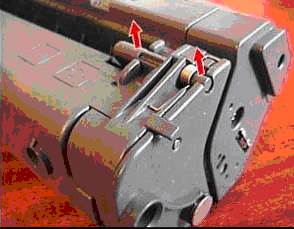 | - вынимаем ось шарнира, для этого подталкиваем ее плоской отверткой изнутри (рядом с темной опорой вала заряда), а после снаружи вытаскиваем, ухватившись плоскогубцами;