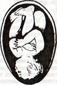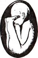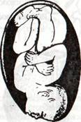Рис. 16б. При головном предлежании, как правило, ко входу в родовые пути голова плода обращена затылком (затылочное предлежание), что встречается в 95 % продольных предлежании. В остальных 5 % случаев головка может располагаться теменем (рис. 16а), лбом или лицом (рис. 16б). При тазовом предлежании ко входу в родовые пути могут быть обращены ягодицы плода (ягодичное предлежание, рис. 17а), ножки (ножное предлежание) или ягодицы с ножками (ягодично-ножное предлежание, рис. 17б).