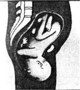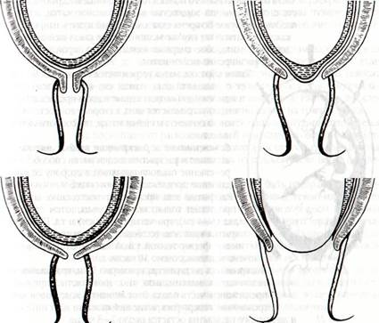 Сокращения матки. При сокращениях мускулатуры матки ее мышечные волокна уплотняются, вследствие чего утолщаются стенки матки. Причем их утолщение от схватки к схватке возрастает. Сокращения матки начинаются от маточного дна, поэтому здесь утолщение стенок максимально. Утолщение мышц дна и верхнего сегмента матки приводит к тому, что мускулатура ее нижнего сегмента и шейки оттягивается в стороны и вверх, в результате чего происходит растяжение и истончение нижнего сегмента матки, а также сглаживание и раскрытие шейки матки (рис. 21). Маточные сокращения приводят к повышению внутриматочного давления. При каждой схватке мускулатура матки давит на содержимое плодного яйца, главным образом на околоплодную жидкость. Плодный пузырь. В результате равномерного давления со стороны дна и стенок матки околоплодные воды устремляются в сторону внутреннего зева канала шейки матки, где сопротивление отсутствует. Под напором околоплодных вод нижний полюс плодного яйца отслаивается от стенок матки и внедряется во внутренний зев канала шейки матки (рис. 20). Часть оболочек нижнего полюса плодного яйца, внедряющегося вместе с околоплодной жидкостью в канал шейки матки, называется плодным пузырем. Во время схваток плодный пузырь напрягается и с каждой схваткой все глубже вклинивается в канал шейки матки. Он действует наподобие гидравлического клина, производя изнутри мягкое расширение шейки матки. Таким образом, матка устремляется вверх и как бы сползает с плодного яйца, толкая его вниз. В свою очередь, плодное яйцо (околоплодные воды и предлежащая часть плода) устремляется вниз, в сторону тонкостенного нижнего сегмента и шейки матки, где сопротивление минимально.