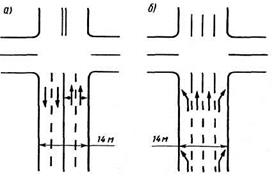 Введение одностороннего движения по двум параллельным улицам (дорогам) является одним из наиболее характерных приемов его организации и воплощает одновременно несколько методических принципов, рассмотренных в гл. 4. Организация одностороннего движения является вместе с тем естественным решением в градостроительной практике при строительстве автомобильных магистралей, известным очень давно. В условиях автомобильного движения одностороннее движение было впервые применено в Филадельфии (США) в 1906 г., а в 1907 г. введено на ряде параллельных улиц в Нью-Йорке. Главное достоинство одностороннего движения заключается в сокращении числа конфликтных точек и прежде всего в устранении конфликта встречных транспортных потоков. Как было отмечено в подразделе 3.5, конфликтные точки встречного движения являются наиболее опасными. Особенно ощутимо сокращается число конфликтных точек на пересечениях. Это подтверждается данными табл. 5.1 при сравнении числа конфликтных точек на пересечении двух дорог с двусторонним движением (по одной полосе в каждом направлении) и двух дороге односторонним (по две полосы каждая). К преимуществам одностороннего движения следует также отнести: – возможности более рационального использования полос проезжей части и осуществления принципа выравнивания состава потоков на каждой из них (специализация полос) (рис. 5.3); – резкое улучшение условий координации светофорного регулирования между пересечениями; 0 – облегчение условий перехода пешеходами проезжей части в результате четкого координированного регулирования и упрощения их ориентировки, так как нет встречного транспортного потока; – повышение безопасности движения в темное время вследствие ликвидации ослепления водителей светом фар встречных транспортных средств.