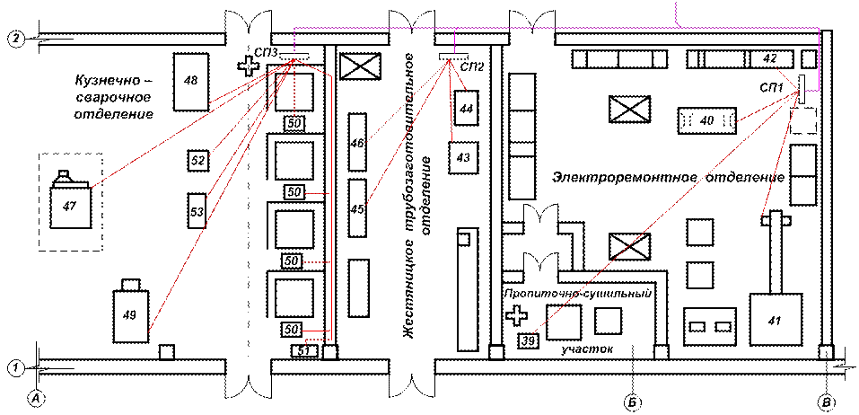 Расчет электрических нагрузок участка производим аналогично расчету нагрузок цеха. Проектируем три СП (см. рис. 3) участка из панелей типа ПР – 85. На участке находится 18 ЭП, на основании этого и плана расположения оборудования выбираем: - одну панель ПР – 85 – 7 – 073 – 21 – У – 3 [6. c. 187] на 10 выключателей - две панели ПР – 85 – 7 – 018 – 21 – У – 3 [6. c. 186] на 6 выключателей