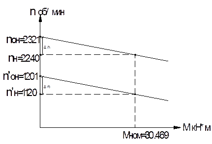3.Определяем перепад скоростей в номинальном режиме. ∆ n= nон - nн = 2321 –2240 = 81 об/мин. 4. Определяем напряжение U' при котором двигатель будет работать со скоростью n'=0, 5 nн. В дальнейшим все величины относящиеся к данному режиму обозначается с одним штрихом. n'=n'о - ∆ n = U'/ Се· Ф - ∆ n; n'о= n'+∆ n; U'= Се(n'+∆ n)=16, 48·575(0, 5·2240+81)/ 10 =114 В; n'о= n'+∆ n=0, 5·2240+81=1201 об/мин; n'=0, 5 nн=1120 об/мин. Строим график механической характеристики для данного режима: