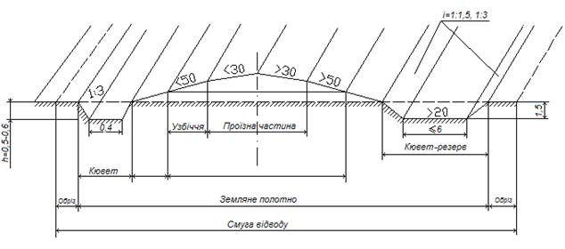 1. Елементи поперечного профілю та їхнє призначення. Поперечним профілем називають розріз дороги вертикальною площиною перпендикулярною до її поздовжньої осі. На поперечному профілі розміщують такі елементи: 1) проїзну частину – головний конструктивний елемент, який забезпечує рух транспорту відповідної вантажопідйомності, габаритних розмірів і з певною швидкістю; проїзна частина покрита дорожнім одягом, який має бути міцним, а поверхня її рівною, жорсткою і без пилу; 2) узбіччя – бокові смуги, що примикають до проїзної частини, вони є упором для дорожнього одягу, дають змогу підвищувати безпеку руху, а також придатні для короткочасної вимушеної зупинки автомобіля та тимчасового розміщення будівельних матеріалів під час ремонту дороги; 3) водовідвідні споруди – поздовжні рови (кювети, кювети-резерви і резерви), призначені для відведення від земляного полотна поверхневої води; 4) обрізи – крайні смуги між водовідвідними спорудами та межами смуг відведення землі під дорогу; призначені для влаштування об’їзного шляху, складання будівельних матеріалів, розміщення декоративного і снігозахисного насадження, а інколи – упорядкованих майданчиків для відпочинку тощо; 5) кювет-резерв – розширений заглиблений кювет, який влаштовують при розробці ґрунту для спорудження насипу (якщо на відстані до 2 км немає виїмки); його ширину визначають кількістю потрібного ґрунту, а глибина становить не більше, ніж 1, 5 м; внутрішній укіс кювету-резерву є продовженням укосу насипу; різниця відміток бровки земляного полотна і дна кювету-резерву становить менш як 4 м; 6) резерв – відрізняється від кювету-резерву тим, що між укосами насипу влаштовують берти – смуги завширшки не менше як 2 м, різниця відміток бровки земляного полотна і дна резерву становить не менше 4 м; 7) нагірний рів – призначений для перехоплення поверхневих вод з укосів і відведення їх у найближчі понижені місця; влаштовують нагірні рови при косогірності більше 1: 10; 8) банкет – призма трикутного поперечного перебігу, відсипана з ґрунту, вийнятого з нагірних ровів, яка збільшує площину поперечного перерізу нагірного рову; 9) смуга відводу – ділянка землі, відведена під будівництво дороги, на якій розміщують усі перелічені елементи дороги і дорожніх споруд.