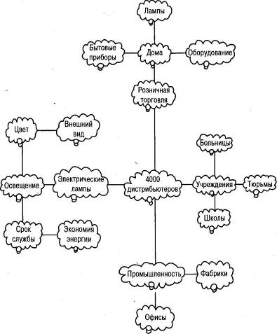 100.□ Часть 2. Линейные игры для ума Кластеры пузырьков подсказывают следующие способы продвижения на рынке консультационных услуг. 1. Маркетинг с помощью рекомендаций бывших клиентов и знакомых, например руководителей банков и предприятий. 2. Персонифицированный маркетинг: рассылка персональных приглашений, писем, обращений в организации. 3. Неперсонифицированный маркетинг: прямая рассылка по почте, обращение в отделы внешних связей, реклама. 4. Захват сфер влияния: обращение к профессионалам, обслуживающим тех же клиентов, что и вы; к людям, от которых зависит принятие решений в организациях — потенциальных клиентах; к руководителям и директорам различных профессиональных объединений; к руководителям производства. 5. Поиск возможностей: новые потребности старых клиентов, потенциальные клиенты, незанятые ниши на рынке сбыта. В результате графического отображения своих мыслей я, например, получил схему продвижения моих услуг на рынок с помощью персонифицированного и неперсонифицированного маркетинга, а также разного рода рекомендации. Кроме того, схема мыслей подсказала мне, где в плане поиска новых возможностей требуется дополнительная информация. Теперь допустим, что вице-президент компании по производству электрических ламп хочет увеличить объем продаж. Посередине страницы он пишет слова «электрические лампы» и соединяет эти слова с процессом «освещения» и системой «четырех тысяч дистрибьютеров». Он начинает записывать все, что приходит в голову, рисовать пузырьки и соединять их. На с. 101 вы можете видеть составленную им схему мыслей. Ключевые концепции исходной схемы таковы: 1. Характеристики электрической лампы: срок службы, мощность, цвет, внешний вид. 2. Потребители: промышленные предприятия, учреждения, розничная торговля. 3. Наличие рынка сбыта. 4. Окупаемость затрат. 5. Повышение качества.