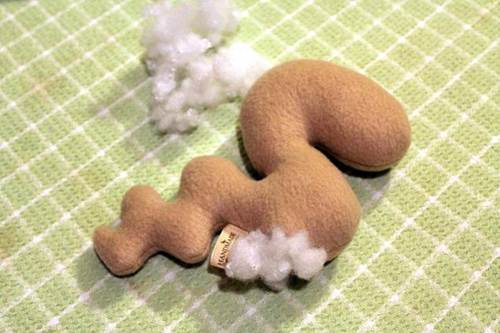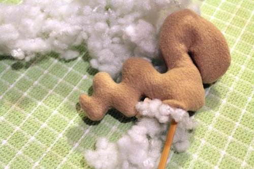 Выворачиваем, и начинаем набивать синтепухом с хвоста, проталкивая палочкой (карандашом).