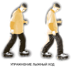 Пусть это смотрится не очень эффектно, зато так проще начать движение, в первый раз встав на ролики. Сделайте шаг - и вы начнете движение, ролики уже катятся. Не надо быстро разгоняться, самое главное - поймать равновесие. ЗАДАЧА: отрывать поочередно ноги от земли и переставлять их; при этом как можно дольше катиться на каждой ноге. ОБРАТИТЕ ВНИМАНИЕ: Самое главное отличие передвижения на роликах от хождения пешком - в том, что во втором случае вы отталкиваетесь мыском, а в первом - всеми четырьмя колесами. ТИПИЧНЫЕ ОШИБКИ: Никогда не отталкивайтесь только передним колесом! НЕ ЗАБЫВАЙТЕ про правильную стойку: постоянный наклон вперед и согнутые в коленях ноги. УПРАЖНЕНИЕ " лыжный ход"