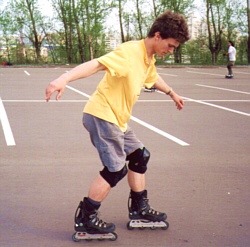 - перед началом разворота ролики стоят не на одной линии: одна нога должна находиться впереди другой на длину ролика (продольная стойка). От направления вращения зависит, какая нога должна быть впереди. поэтому, для начала: определитесь, в какую сторону вам удобнее поворачиваться (кстати, большинству людей поворот влево дается проще). Если удобнее поворачиваться налево, то впереди должна быть праваянога; а если удобнее поворот направо - то впереди леваянога.