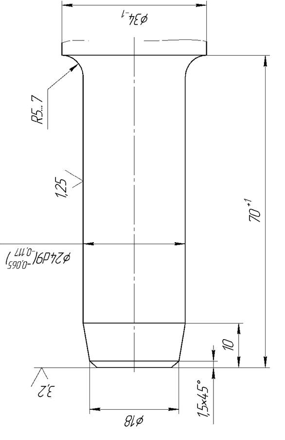 В корпусе стакана 1 расположено пусковое устройство. Оно состоит из тол- кателя 16, шарика 26, пружины клапана 14, втулки направляющей 27. Здесь же установлен штуцер 17 совместно с ниппелем 19 и накидной гайкой 18 для закрепления воздухоподводящего шланга. Стакан зафиксирован от проворота на стволе стопором 23. Стопор в стволе и пазе стакана удерживается кольцом стопорным 21. На стакане штуцером подвижно закреплена рукоятка 3. Между стаканом и рукояткой установлена пружина-амортизатор 13 и прокладка 24. На стволе снаружи расположен кожух 4 для отвода отработанного воздуха, глушения шума и предотвращения попадания грязи через выхлопные отверстия внутрь ствола. В нижней части ствола запрессованы перемычка 22 и втулка 29, в отверстие которой вводится хвостовик рабочего инструмента. Рабочий инструмент (пика) фиксируется в осевом направлении буксой 30 и концевой пружиной 12. 4.2. При нажатии на рукоятку толкатель 16 перемещается в гнезде стакана и, утопив шарик, открывает доступ сжатого воздуха через ниппель, штуцер и отверстие в стакане к воздухораспределительному устройству которое направляет сжатый воздух попеременно в верхнюю и нижнюю части ствола. Под действием сжатого воздуха ударник совершает возвратно-поступательные движения и наносит удары по хвостовику рабочего инструмента. Хвостовик рабочего инструмента показан на рис.2.
