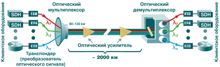№17 1). Мультиплексорам DWDM (в отличии от более традиционных WDM) присущи две отличительные черты: использование только одного окна прозрачности 1550 нм, в пределах области усиления EDFA (1530-1560 нм); малые расстояние ДА, между мультиплексными каналами (3, 2 / 1, 6 / 0, 8 или 0, 4 нм). Кроме этого, поскольку мультиплексоры DWDM рассчитаны на работу с большим числом каналов (до 32-х и более), то наряду с устройствами DWDM, в которых мультиплексируются (демультиплексируются) одновременно все каналы, допускаются также новые устройства, не имеющие аналогов в системах WDM и работающие в режиме добавления или вывода одного и более каналов в/из основного мультиплексного потока, представленного ббльши*. числом других каналов.^ Так как выходные порты/полюса демультиплексора закреплены за определенными длинами волн, говорят, что такое устройство осуществляет пассивную маршрутизацию по длинам волн. Из-за малых расстояний между каналами и необходимости работы с большим числом каналов одновременно, изготовление мультиплексоров DWDM требует значительно большей прецизионности по сравнению с WDM мультиплексорами (использующими обычно окна прозрачности 1310 нм, 1550 нм или дополнительно область длин волн в окрестности 1650 нм). Также важно обеспечить высокие характеристики по ближним (коэффициент направленности) и дальним (изоляция) переходным помехам на полюсах DWDM устройства. Все это приводит к более высокой стоимости DWDM устройств по сравнению WDM. Типовая схема DWDM мультиплексора с зеркальным отражающим элементом показана на рис1. Рассмотрим его работу в режиме демультиплексирования. Приходящий мультиплексный сигнал попадает на входной порт. Затем этот сигнал проходит через волновод- пластину и распределяется по множеству волноводов, представляющих дифракционную структуру AWG (arrayed waveguide grating). По-прежнему сигнал в каждом из волноводов остается мультиплексным, а каждый канал (Х1}Х2,...) остается представленным во всех волноводах. Далее происходит отражение сигналов от зеркальной поверхности, и, в итоге, световые потоки вновь собираются в волноводе-пластине, где происходит их фокусировка и интерференция - образуются пространственно разнесенные интерференционные максимумы интенсивности, соответствующие разным каналам. Геометрия волновода-пластины, в частности, расположение выходных полюсов, и длины волноводов структуры AWG рассчитываются таким образом, чтобы интерференционные максимумы совпадали с выходными полюсами. Мультиплексирование происходит обратным путем. Другой способ построения мультиплексора базируется не на одной, а на паре волново- дов-пластин (рис. 8.1 б). Принцип действия такого устройства аналогичен предыдущему случаю за исключением того, что здесь для фокусировки и интерференции используется дополнительная пластина.