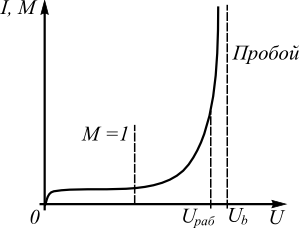 Зависимость тока (I) и коэффициента умножения (M) от обратного напряжения (U) на ЛФД. Существует ряд формул для коэффициента лавинного умножения (M), довольно информативной является следующая:
