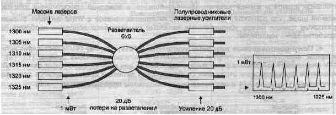2).Полупроводниковые лазерные усилители (ППЛУ). Основу ППЛУ составляет активная среда, аналогичная той, которая используется в полупроводниковых лазерах [11, 12]. В ППЛУ отсутствуют зеркальные резонаторы, характерные для полупроводниковых лазеров. Для уменьшения френелевского отражения с обеих сторон активной среды наносится специальное покрытие толщиной Х/4 с согласованным показателем преломления, рис.