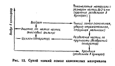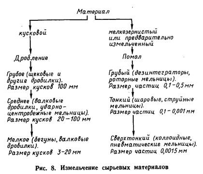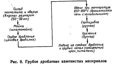 Подготовка каменистых материалов. Основные сырьевые материалы поступают на переработку в виде кусков (кроме песка). В зависимости от величины кусков дробление производят так, как показано на рис. 8. На заводах сырьевые материалы обычно подвергают