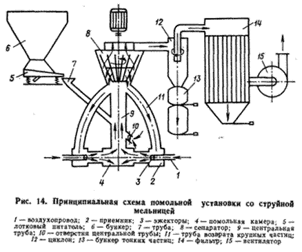 Добавка в шаровую мельницу ПАВ (до 1 % по массе) ускоряет помол материала за счет повышения диспергирующего действия воды в микротрещинах материала. Сухой тонкий помол. Этот способ помола каменистых материалов в настоящее время еще не нашел широкого применения в производстве фарфоро-фаянсовых изделий бытового назначения. Однако опыт отдельных фарфоровых заводов, отечественных и зарубежных, подтверждает целесообразность его использования. Сухой тонкий помол каменистых материалов производят в конических шаровых, ударно-отражательных или струйных мельницах непрерывного действия (рис. 13). Производительность линии тонкого помола каменистых материалов 1, 2—1, 5 т/ч, расход электроэнергии 65— 75 кВт'Ч, воздуха около 10 тыс. м3/ч (при давлении 0, 51—0, 58 МПа) на 1 т измельченного материала. Помол в струйных мельницах практически сводит к минимуму загрязнение материала и обеспечивает высокую однородность помола (рис. 14) с остроугольной формой частиц. Выход тонких фракций в 2 раза превосходит выход таких же фракций при помоле в мельницах других конструкций. Производительность установки примерно 30 т/ч. Хорошо зарекомендовали себя в работе струйные мельницы СМЖ-30 и др. Расход электроэнергии, потребляемой струйными мельницами, почти в 10 раз больше, чем при пользовании шаровыми мельницами. Однако они обеспечивают выход около 60% частиц размером < 10 мкм, чего нельзя достигнуть в шаровых мельницах.