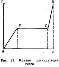 Формовочный гипс. В себестоимости фарфоровых и фаянсовых изделий бытового назначения расходы на формовое хозяйство из гипса составляют от 1, 7 до 3, 4%, а трудовые затраты около 10% $бщей трудоемкости изготовления изделий. Формовочный гипс представляет собой тонкомолотый порошок полуводного гидрата сернокислого кальция CaS04-V2H20 следующего состава: 38% СаО, 55, 2 S03, 6, 2% Н20, получаемый путем обработки природного двуводного гипса CaS04-2H20. Гипсовый камень должен соответствовать требованиям ГОСТ 4013—74. Процесс дегидратации двуводного гипса протекает по реакции 130—170°С CaS04-2H20; * CaSO4.0, 5HsO + 1, 5 Н20. Кривая дегидратации гипса приведена на рис. 33. Участок кривой АВ соответствует продолжительности подогрева двуводного гипса до начала дегидратации, участок ВС — периоду дегидратации при температ}ре 130—170° С, участок CD — окончанию процесса дегидратации с повышением температуры до точки D (180— 190°С), которая превышает температуру дегидратации на 20—25° С, что необходимо для полного завершения процесса дегидратации более крупных зерен двуводного гипса. К формовочному гипсу предъявляют следующие требования: при затворении с водой давать однородную массу; обеспечивать повышенную пористость и' достаточную механическую прочность отливок; иметь небольшое объемное расширение при литье и постоянные сроки схватывания, позволяющие отливать формы для крупных изделий. Физико-технические свойства полуводного гипса характеризуются (по МРТУ 21-31-76) следующими показателями: тонкость помола по остатку на сите № 02 (918 отв/см2) не более 0, 5%, начало схватывания не ранее 8 мин, конец — не позже 25 мин, объемное расширение не более 0, 15%, предел прочности через 7 сут при растяжении не менее 2, 3 МПа, при сжатии не менее 16 МПа,