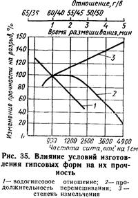 Водогипсовое соотношение (гипс: вода) во многом определяет качество гипсовых форм. Это объясняется тем, что для полной гидратации гипса требуется 18, 6% (по массе) воды, остальная вода — более 80% остается в свободном состоянии, обусловливая пористость высушенной формы, ее структуру и прочность. Прочность отливок из гипса обратно пропорциональна консистенции гипсового раствора. С повышением водогипсового отношения увеличивается размер кристаллов двуводного гипса, с понижением — уменьшается не только пористость, но и средний размер пор. При изготовлении форм руководствуются такими оптимальными соотношениями гипс: вода, как 1: 1 — для форм-литья; 1, 43; 1 —для форм пластического формования; 1, 6: 1—для изготовления капов и моделей; 1, 25: 1 для форм, предназначенных для литья и пластического формования. На практике чаще всего применяют следующие соотношения: 56: 44 — для форм, используемых на шпиндельных станках и для литья тонкостенных изделий; 60: 40 — для форм, используемых для формования изделий на полуавтоматах и автоматах; 50: 50 — для форм, используемых для литья рядовых изделий и формования капселей; 67: 33 — для приготовления капов и моделей. Вакуумирование гипсового раствора в течение 1, 5— 2 мин при глубине вакуума 0, 8—0, 9 МПа удлиняет сроки схватывания на 15—20% и повышает механическую прочность отливок на 18—20%, улучшает состояние поверхности формы и повышает оборачиваемость форм на 20—25%. Вакуумированный гипсовый раствор обладает повышенной текучестью, лучше заполняет все неровности и соединения капа. Вакуумирование способствует снижению пористости форм на 10—12% и изменяет характер пор. Структура формы более однородна (рис. 34) и не имеет замкнутых воздушных включений, снижающих прочность формы и не участвующих в капиллярном отсосе влаги. Коэффициент расширения ва-куумированного гипсового раствора снижается. Качество и экономичность гипсового раствора в процессе его приготовления повышаются при использовании механизированных и автоматизированных установок. В ФРГ, например, используются установки «Роко-вакумат» десяти типоразмеров производительностью от 100 до 1600 л/ч. Смешивание гипса с водой осуществляется одновременно с вакуумированием раствора в специальных ре- -зервауарах. Дозирование гипса и воды, глубина и продолжительность вакуумирования автоматизированы. Разгрузка вакуумных резервуаров и подача гипсового раствора к месту отливки форм на расстояние до 150 м производятся пневматически. Продолжительность загрузки, приготовления раствора, разгрузки и чистки составляет 2—3 мин в зависимости от вместимости резервуара (100—1600л).