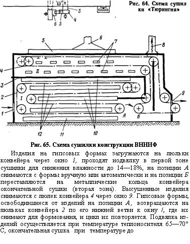 Конвейерные (люлечные) сушилки представляют собой цепной конвейер с подвешенными качающимися полками, перемещающийся в сушильной камере, разделенной внутри перегородками. По направлению перемещения конвейера сушилки бывают с вертикальным, горизонтальным и П-образным движением. На заводах широко используют сушилки ВНИИФ, «Тюрингия» (ГДР), фирм «Нетчш», «Липперт» (ФРГ) и др. Конвейерные сушилки являются одновременно связующим звеном между участками формования и оправки изделий. Сушилка «Тюрингия» имеет длину 11, 5 и 14 м с горизонтальным направлением движения изделий и теплоносителя (рис. 64). Прямоугольная камера сушилки разделена горизонтальными перегородками на шесть ярусов, верхний ярус предназначен для возврата гипсовых форм на позицию формования, нижний — для отбора отработанного теплоносителя. Воздух, нагретый в паровоздушном калорифере 1, расположенном в середине сушилки, поступает на сушку в рабочие ярусы сушилки по воздухопроводам 2 и 3, расположенным снаружи в средней части сушилки. Движение горячего воздуха в сушилке — горизонтальное. Отработанный теплоноситель удаляется из сушилки через нижний ряд при помощи вентилятора 4. Часть этого теплоносителя через шибер 5 патрубком 6 направляется для повторного использования (рециркуляции). Сформованные изделия на гипсовых формах устанавливают на полки конвейера сушилки через окно 7. В процессе сушки изделия находятся в постоянном движении и равномерно омываются теплоносителем, что позволяет высушить их без дефектов. Сухие изделия вынимают из гипсовых форм через окно 8 у противоположного конца сушилки. Гипсовые формы, оставленные на полках конвейера, поступают на участок формования через шестой ряд, подсушиваясь по пути следования. Производительность сушилки 430 шт/ч при длительности сушки тарелок диаметром 240 мм до 4, 5 ч и удельном расходе теплоты 7, 1 МДж на 1 кг испаренной влаги. При двухстадийной сушке изделий (рис. 65) используют конвейерные сушилки, разделенные горизонтальной перегородкой 3 на две зоны: нижнюю (зона I) с цепным люлечным конвейером 2 и верхнюю (зона II) с конвейером 4. В отличие от непрерывного движения конвейеров в сушилке «Тюрингия» люлечные конвейеры имеют пульсирующее движение (движение 4, 5 с, выстаивание 3, 5 с). Движение конвейеров синхронное. 110° С. Для этого теплоноситель подается направленным потоком (через перфорированные насадки) на изделия коробами 7, расположенными над полками конвейера 12 (с изделиями). Скорость воздушного потока после насадок 13—15 м/с. Отработанный теплоноситель удаляют из сушилки через отверстия < в коробе // (внизу первой зоны) с таким расчетом, чтобы часть его была использована повторно (рециркуляция), а часть удалена в атмосферу через коллектор 5 и трубу 6. Поскольку во второй зоне необходимо поддерживать температуру около 110° С, то для этого используют радиационный нагрев, создаваемый горелками красного и инфракрасного излучения. Горелки располагают под изделиями на расстоянии 150—250 мм. Высушенные изделия охлаждают воздухом, поступающим из цеха через окно 9 и удаляемым через трубопровод 8. При двухстадийной сушке и комбинированном нагреве длительность сушки тарелок сокращается до 30 мин, производительность возрастает до 600— 1200 шт/ч, а расход теплоты на испарение 1 кг влаги снижается до 4, 2—6, 7 МДж. Несмотря на то что конвейе
