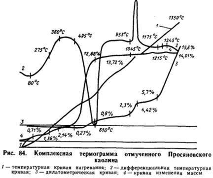 Каолинит и другие глинистые минералы при нагревании претерпевают наиболее сложные изменения, характеризующиеся термическими эффектами на дифференциальной кривой комплексной термограммы (рис. §4). Экзотермические процессы сопровождаются выделением теплоты и фиксируются на дифференциальной кривой! 2 положительными пиками. Эндотермические процессы сопровождаются поглощением теплоты, что отмечено на кривой «провалами» — отрицательными пиками. Кроме дифференциальной кривой на рисунке располагаются кривые температуры нагревания печной среды 1, изменения объемов 3 и массы образца 4. Первый, слабо выраженный эндотермический эффект характеризует удаление свободной воды. Хотя изделия, поступающие на обжиг, имеют незначительную влажность (1—4%), интенсивное удаление ее может вызвать появление трещин. При быстром нагревании удаление влаги происходит при более высоких, чем обычно, температурах— 140—160°С, что может привести к разрушению изделий. Химически связанная вода удаляется в интервале 450—850° С в зависимости от природы глинистых минералов, их структуры и скорости нагрева. Основное количество (12 из 13%) химически связанной воды удаляется при температуре около 610° С, если длительность нагрева составляет не менее 10—12 мин. При скоростном нагреве удаление остатков (менее 1%) воды закан-' чивается при 900—1000° С. Удаление химически связан» ной воды сопровождается четко выраженным эндотермическим эффектом. Разрушаются молекулы каолинита, перестраивается кристаллическая решетка и ослабляется химическая связь между А1203 и Si02 в каолинито-вом остатке. Удаление химически связанной воды сопровождается потерей массы и незначительной усадкой материала, что фиксируется на соответствующих кривых. Процесс дегидратации каолинита протекает с образованием метакаолинита по реакции Al203-2Si02-2HaO -> Ala03-2SiOa»+ 2Н20. После обезвоживания в каолинитовой остатке сохраняются некоторая степень кристалличности и следы воды, удаляемой при более высокой температуре. Большинство исследователей рассматривают метакаолинит как промежуточную фазу при переходе каолинита в муллит в процессе нагревания. Другие исследователи высказывают мнение, что продуктом дегидратации молекулы каолинита являются свободные оксиды по реакции: Al203-2SiO2-2H20-*Al203 + 2Si02 + 2Н20. Процесс дегидратации следует рассматривать как кристалло-химический процесс изменения двухслойной решетки каолинита с поглощением значительного количества теплоты, фиксируемого на кривой эндотермическим эффектом. Первый экзотермический эффект в интервале 900—1050° С (на кривой 2 при 1045° С рис. 84) объясняется перестройкой кристаллической решетки остатка каолинита, возможным распадом метакаолинита на свободные оксиды, разрывом связей между кремне-кислородными тетраэдрами и частичным повышением координационного числа ионов Al4 — А16; образованием изоморфного глинозема углинозема и его интенсивной кристаллизацией. Второй и третий экзотермические эффекты соответственно при 1150—1300 и 1210—1320° С связаны с образованием муллита и кристобаллита, а возможно и с кристаллизацией кристобалита из аморфного кремнезема—продукта распада каолинита, хотя последнее мало вероятно из-за высокой растворимости аморфного кремнезема в силикатном расплаве. На кривой эти эффекты че отражены, хотя хорошо фиксируются на кривой изм