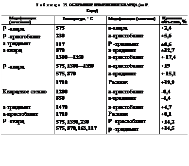 шей (центров) кристаллизации, на скорость кристаллизации, на решетку и свойства кристаллических фаз. Вводом минерализаторов получают изделия с заданными свойствами. Установлено, например, что оксиды лития и фтора в 3 раза интенсивнее оксида цинка уплотняют черепок изделия и при одинаковой пористости на 35— 40% больше снижают температуру обжига, повышают механическую прочность. Минерализующая способности катионов постоянного заряда увеличивается с уменьшением их радиуса. Большое влияние на процесс образования муллита оказывает состав печной атмосферы. Образование муллита в присутствии водяного пара ускоряется в 3, 5 раза, водорода — в 2 раза, азота — в 1, 6 раза по сравнению со скоростью протекания процесса муллитизации в воздушной среде. Восстановительная среда и присутствие FeO, образовавшегося в результате восстановления Fe203, способствуют более низкотемпературной (около 850° С) кристаллизации муллита из расплава и повышению его содержания в черепке изделий. Муллит, образовавшийся в черепке изделий при отсутствии жидкой фазы (первичный муллит), находится как бы в зародышевом состоянии, он очень мелкий, трудно различим обычными методами изучения микроструктуры. Установлено, что образование первичного муллита протекает в три стадии: образование изометрических шарообразных зародышевых форм муллита диаметром 0, 1—0, 2 мкм; рост и спекание изометрических образований с образованием цилиндрических и призматических кристаллов длиной до 10 мкм и их агрегаций; равномерное развитие кристаллов муллита, вкрапленных в стеклофазу. С повышением температуры обжига изделий содержание муллита снижается, так как происходит интенсивная рекристаллизация мелких кристаллов в полевошпатовом расплаве в более крупные кристаллы вторичного муллита в виде тончайших переплетенных между собой игловидных кристалликов, пронизывающих (армирующих) стеклофазу и влияющих на важнейшие свойства изделий. Максимально возможное количество муллита в фарфоре при введении 50% глинистых компонентов в массу составляет около 25%. Кварц играет важную роль в формировании черепка изделий, его влияние обусловлено большим разнообразием преобразований, претерпеваемых им при обжиге изделий (табл. 15). Из всех полиморфных разновидностей кристаллического кремнезема в фарфоре основными являются: а и Р»кварц, а, Р и у-тридимит. Кристобалит в фарфоре составляет менее 4%. Полиморфные превращения кремнезема не равнозначны по глубине происходящих изменений в кристаллической решетке. Кремнезем, встречающийся в природе, находится в форме р-кварца. При температуре 575° С р-кварц переходит в а-кварц с увеличением в объеме иа 2, 4%. Опасность этого перехода повышается тем, что он протекает очень быстро и может стать причиной растрескивания изделий. При температуре 870°С а-кварц переходит в а-тридимит с увеличением объема на 12, 7%, а часть а-кварца переходит в а-кристобалит при 1300—1350°С с увеличением объема на 17, 4%- Поскольку эти превращения протекают очень медленно, а температурные условия меняются быстро, в черепке изделий, обожженных при 1350—1410° С, будут находиться зерна а-кварца, на поверХност" и которых в виде тонкого слоя располагаются зерна а-кристобалита, а также кристаллы муллита, стекловидная фаза и поры. Объемные изменения этих переходов представляют меньшую опасность растре