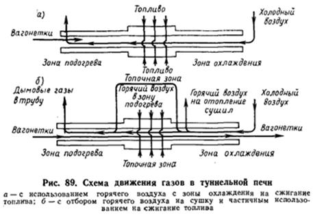 изделий несгоревшими частицами топлива и золой. Поэтому приходится обжигать изделия в капселях, особенно в печах, работающих на жидком топливе. К печам открытого пламени относятся все печи периодического действия, часть туннельных и щелевых печей. В муфельных печах (обычных и щелевых) нагрев изделий осуществляется через экранирующие стены, отделяющие полости (каналы) печи, по которым движутся продукты сгорания топлива. Теплообмен осуществляется в основном за счет излучения стенок муфеля. Муфельные печи менее выгодны экономически из-за большого расхода топлива, они более сложны в эксплуатации, но в них обеспечивается более высокое качество обжигаемых изделий. По направлению движения продуктов сгорания топлива туннельные печи являются противоточными. В начале рабочего канала печи (зона подогрева) навстречу обжигаемым изделиям движутся топочные газы из зоны обжига, а в зоне охлаждения—холодный воздух. Схема движения газов в туннельной печи приведена на рис. 89.