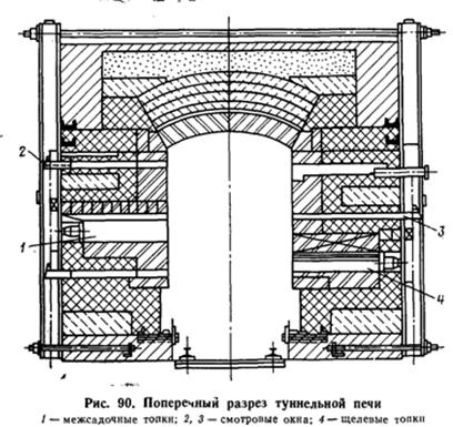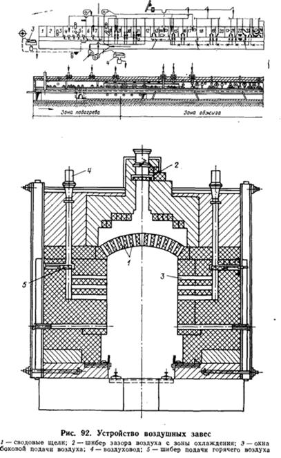 Печной канал условно разделяется на зоны подогрева, обжига, охлаждения и на позиции. Длина одной позиции обычно равна длине вагонетки. В печи длиной рабочего канала на 44 позиции зона подогрева занимает 9 позиций (20%), обжига —16 позиций (37%), охлаждения —19 позиций (43%). В туннельных печах для обжига хозяйственного фарфора соотношение длин зон подогрева обжига и охлаждения равно соответственно (0, 67—0, 87): 1: (1, 45—1, 67). Зона подогрева заканчивается около топочных устройств. Она имеет воздушные завесы (рис. 92) и каналы для отбора отходящих газов и подачи горячего воздуха в зоны охлаждения. Отбор отходящих газов осуществляется сосредоточенно через одно окно с каждой стороны печи или рассредоточение через систему окон и каналов с каждой стороны печи. У печей для обжига фаянса соотношение зон подогрева и большого огня составляет от 3: 1 до 3, 5: 1. Длина зоны большого огня печей для обжига фаянса составляет всего 9—12 м, а печей для обжига фарфора 16—39 м.