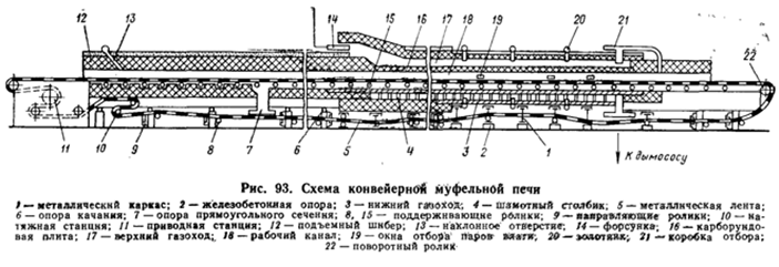 В каждой зоне поддерживается необходимая печная атмосфера: при обжиге фарфора в зоне подогрева и охлаждения — окислительная; в начале зоны обжига — восстановительная; в конце ее — слабо восстановительная, или нейтральная; при обжиге фаянса и майолики во всех зонах — окислительная газовая среда. Качественное различие газовой среды в каждой зоне достигается регулированием подачи топлива и воздуха для его сжигания. Туннельные печи просты по устройству и имеют высокую производительность. К их недостаткам относятся большие (300—400° С) перепады температур по сечению печи в начале зоны подогрева, трудность механизации и автоматизации многоярусной установки изделий на этажерки вагонеток, низкий КПД. Печи для скоростного утельного обжига бывают двух типов: муфельные, в которых используются жидкое ■ топливо и прямой нагрев, и безмуфельные, работающие на природном газе при максимальной температуре обжига 800—850° С. Муфельная конвейерная печь (рис. 93),, работающая на жидком топливе, сложена, из огнеупорного и теплоизоляционного кирпича, с удлиненной зоной высоких температур за счет устройства восьми горелок. Свод канала печи — арочный. Подогрев изделий осуществляется при помощи нижнего и верхнего газоходов, устроенных по всей ширине рабочего канала печи и огражденных от него карбидо-кремниевыми плитами. Вверху, ниже основного свода устроен второй свод из таких же плит, образующий по длине зоны подогрева верхний газоход высотой 0, 14 м. Зона обжига аналогична по конструкции зоне подогрева с той разницей, что толщина стен, свода и пода увеличена. В зоне охлаждения второй свод (муфель) отсутствует. Для уменьшения подсоса воздуха в рабочий канал печи в начале зоны подогрева и в зоне охлаждения (в закрытой части) предусмотрены два подъемных шибера. Подача изделий в печь для обжига производится на сетчатой конвейерной ленте (открытом участке зоны подогрева) из жаропрочной стали, которая приводится в движение приводной станцией с электродвигателем мощностью 0, 6 кВт. Лента движется по роликам, установленным по всей длине печи на расстоянии 0, 45— 0, 5 м друг от друга. Для роликов зон подогрева и охлаждения применяется сталь марки Ст. 3, а для остальных—сталь марки Х23Н13. Скорость движения конвейерной ленты может меняться от 0, 021 до 0, 4 м в 1 мин, что позволяет регулировать продолжительность обжига в печи от 40 мин до 14 ч. Срок службы сетки конвейера до 1, 5 лет. Жидкое топливо (мазут) сжигается при помощи восьми форсунок низкого давления, расположенных в конце верхнего и нижнего газоходов (по четыре в каждом). Воздух, необходимый для горения мазута, поступает по воздухопроводу от компрессорной станции. Удаление паров влаги из рабочего канала печи производится через специальные окна. Нагретый воздух в зоне охлаждения выпускается через прямоугольное отверстие в поде печи на расстоянии 4, 25 м от конца закрытой части зоны охлаждения. Для предотвращения обратных воздушных потоков из зоны обжига в зону охлаждения предусмотрена воздушная завеса — подача теплого воздуха в конце зоны охлаждения через наклонное (45°) отверстие в своде печи. Отверстие при помощи воздуховода соединено с воздухопроводом, подающим воздух, в сушилку. Отбор дымовых газов в зоне подогрева осуществляется сосредоточенным способом через проемы в нижних секциях и металлические дым