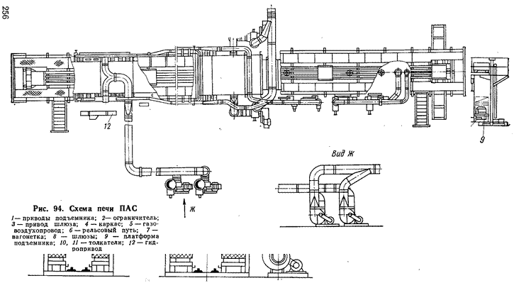 Для обжига фарфоровых и фаянсовых изделий в основном используют одноканальные пламенные туннельные печи прямого нагрева и реже муфельные. Размеры рабочего туннеля печей колеблются в широких пределах: длина 60—120 м, ширина 1—1, 85 м, высота от пода вагонетки до замка свода 1—1, 93 м. В конструкцию канала печи входят (кроме стен и свода) металлический каркас, лабиринтовые стыки стен и вагонеток с песочными затворами и песочницами, пес-коуловители, смотровые и аварийные окна, топки, двери с торцов канала печи, камеры с шлюзовыми затворами, смотровые подвагонеточные подвалы (подподовый канал) и другие элементы (рис. 90).