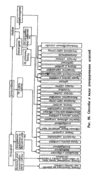 Способы декорирования фарфоровых, фаянсовых, тонкокаменных и майоликовых изделий многочисленны (рис. 96). Соотношение основных живописных разделок составляет, %: деколь 60, аэрограф 10, отводка (ленты) 15, штамп и печать 5, ручная роспись 10.