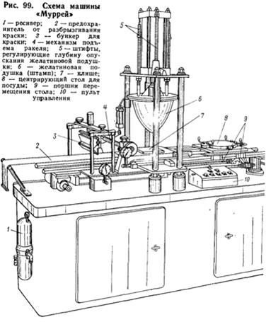 При глубокой печати рисунок углублен ниже поверхности формы. Переносить рисунок с металлической гравюры непосредственно на керамические изделия невозможно. В таких случаях, а также для многоцветной печати широко применяют прием перевода рисунка при помощи посредников — резины, желатина (в виде мембран), грушевидных устройств, папиросной бумаги. Декорирование изделий способом глубокой печати с использованием папиросной бумаги применяют при нанесении однотонного рисунка любой сложности как на утельное, так и на глазурованное изделие. Процесс декорирования происходит в два этапа: получение оттисков рисунка на бумаге и перенесение рисунка с бумаги на поверхность изделия. На протертую пластину (вал) с заглубленной формой рисунка, заполненной краской, накладывают влажный лист папиросной бумаги, покрывают его бумагой и войлоком и пропускают через прижимные вальцы. В результате изображение переходит на лист бумаги, который затем разрезают на отдельные лепки. Влажный оттиск накладывают на очищенную поверхность изделия, слегка прижимают влажной губкой и прокатывают войлочным валиком. После нанесения рисунка изделие подсушивают и направляют на обжиг или дополнительную раскраску вручную отпечатанного контура рисунка, на отводку и т. д. При подглазурном декорировании всеми видами полиграфической печати в качестве связущего в красках используют патоку, глицерин, сахар, а не связки на маслах (олифе, минеральном масле и др.), чтобы избежать дополнительного обжига до температуры 600—800° С. Без этого обжига к участкам, покрытым краской с масляной связкой, глазурь не пристает. Производительность труда при выполнении операций на конвейере на 30—40% выше по сравнению с декорированием изделий вручную. При механизации указанного процесса рисунок переводится не на бумагу, а на эластичные штампы из мягкой резины, желатина и т. д. Высокое качество декорирования, клеймление дна плоских изделий, а также нанесение виньеток и рисунков способом глубокой печати, обеспечивается на машине «Муррей» английской фирмы «Сервис Инжинирс» (рис. 99). Использование желатиновой подушки позволяет получить четкий рисунок, несмотря на возможные неровности и деформацию изделий. Каретка, совершая возвратно-поступательное движение, подводит клише (гравированную доску) под бункер для нанесения на него краски. При обратном движении излишек краски снимается ракелем (ножом), оставляя ее только в углублениях рисунка. Штамп —желатиновая подушка — опускается на клише, и на его поверхности отпечатывается рисунок. При обратном движении каретки под бункер с краской тарелки или блюдца, установленные на центрирующем столике, поступают под штамп, который, опускаясь, переносит рисунок на поверхность изделия. Производительность машины 480 изделий в час, расход сжатого воздуха — 1 м3/мин при давлении 0, 5— 0, 6 МПа. Желатиновую подушку по мере загрязнения протирают влажной тряпкой, а затем спиртом и припудривают тальком. Декорирование через сетку (шелкография) — один из наиболее прогрессивных и экономичных способов нанесения декора. С помощью шелкографии можно выполнять как однотонные, так и многоцветные рисунки любой сложности.