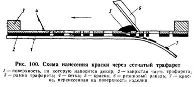 От правильного выбора материала для трафаретов — ткани, сеток и лаков, а также органической пленки, обеспечивающей перенос рисунка фотохимическим методом, — зависят толщина слоя наносимой краски, механическая прочность, химическая стойкость, четкость контуров, воспроизводимость мелких элементов рисунка. Учитывая густоту сетки и необходимость получения четкого контура рисунка, краску тщательно растирают и пропускают через сито № 01 (3460 отв/см2). Декорируют изделия вручную или на полуавтоматах различных типов. Производительность даже ручного декорирования способом шелкографии в 2—3 раза выше производительности ручного декорирования глубокой печатью. При многоцветном рисунке краску каждого цвета наносят на отдельной рабочей позиции или на разных полуавтоматах, установленных последовательно. При этом должно быть обеспечено промежуточное подсушивание каждого цветового оттиска.