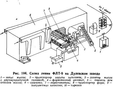 В нижней части зоны предварительной сушки проходит конвейер с люльками, на которых размещены гипсовые формы с изделиями. Движение цепей нижней и верхней зон сушилки синхронизированы с работой формовочного автомата. Теплоносителем является горячий воздух, получаемый в специальных нагревателях (паровых или водяных). Давление пара 0, 3—0, 5 МПа. Температура теплоносителя в зонах предварительной сушки составляет 65—70° С, в зоне окончательной сушки — 95—110° С. Циркуляция воздуха, осуществляемая вентиляторами по всем трем зонам, обеспечивает равномерную сушку изделий (рис. 106). Производительность линии достигает 1, 2 тыс. изделий в 1 ч.